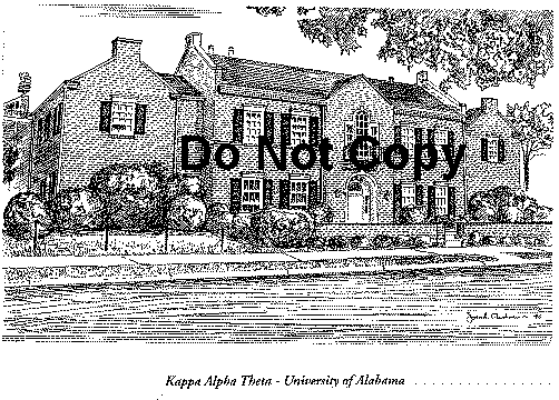 Prints of ink drawings by Jack Andrews, of fraternities, sororities, and other buildings at the University of Alabama Kappa Alpha Theta.