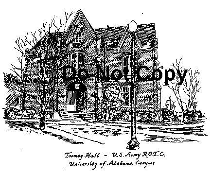 Prints of ink drawings by Jack Andrews, of fraternities, sororities, and other buildings at the University of Alabama Toumey Hall.